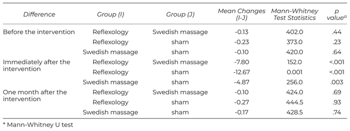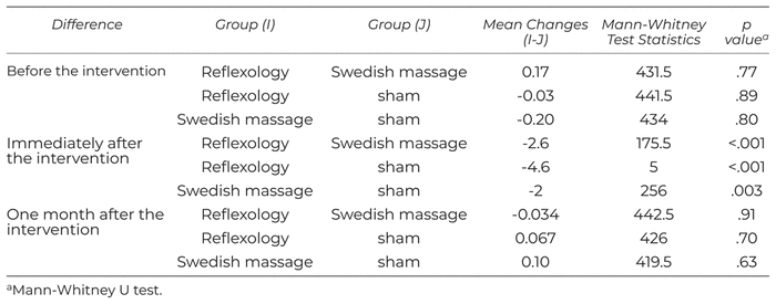 Based on the results of Mann-Whitney U test, sleep quality difference immediately after the intervention was significantly better in the reflexology group than the Swedish massage (p < .001) and sham groups (p < .001). In addition, scores for immediately after the intervention were significantly better in the Swedish massage group than the sham group (p = .003) (Table 6).
