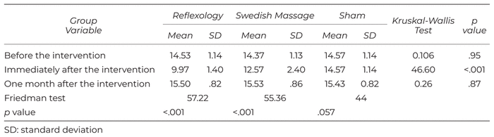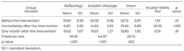The results showed that immediately after the intervention, sleep quality was significantly better in the foot reflexology group than the Swedish foot massage and sham groups (p < .001). Sleep quality decreased in one-month follow-up after the intervention in all three groups, which means that with the cessation of the intervention, sleep quality decreased again (Table 5).