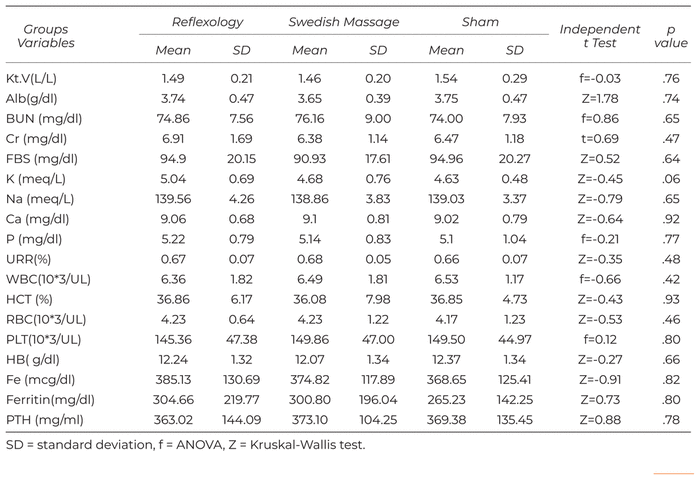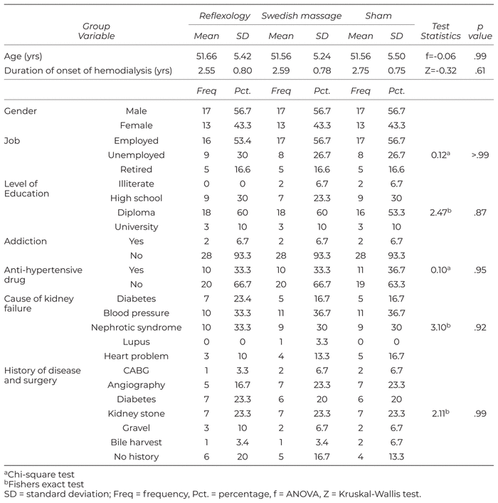 The majority of the samples in three groups were male subjects with diploma. There were no statistically significant differences in terms of age, duration of dialysis, gender, level of education, job, history of dialysis, history of addiction, antihypertensive drug, cause of kidney failure, and history of disease and surgery. All three groups were identical in terms of these variables (Table 1).
