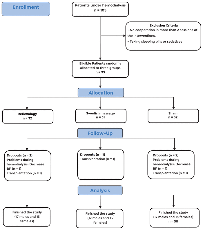 Inclusion criteria included being 18 to 65 years old,(26) three months or more since the first dialysis,(27) having at least three hemodialysis treatments per week lasting 4 hours each time,(28) having no medical prohibition for the intervention such as foot ulcers, amputation, and orthopedic problems,(29) having no debilitating and chronic diseases such as cancer, chronic respiratory failure, heart failure, rheumatoid arthritis, and lupus erythematosus,(29) having no psychological disorders known as depression and bipolar disorder according to the patient’s self-declaration, and diagnosis of RLS based on completing a diagnosis questionnaire.